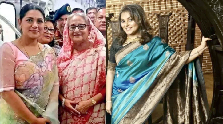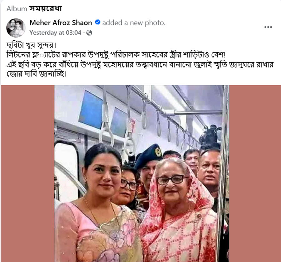 সাবেক প্রধানমন্ত্রী শেখ হাসিনার সঙ্গে মেট্রো রেলে অভিনেত্রী নুসরাত ইমরোজ তিশার একটি ছবি শেয়ার করেছেন শাওন। এই ছবিতে তিশাকে শাড়ি পরা অবস্থায় দেখা যাচ্ছে।