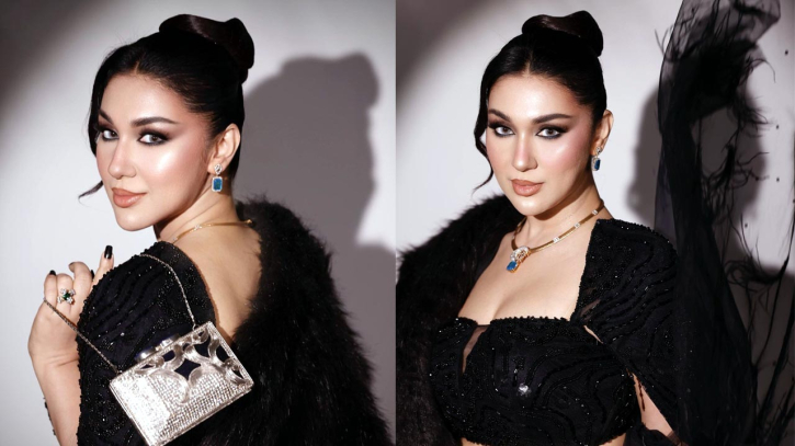 সাজের ক্ষেত্রেও ছিল পরিমিত ও মার্জিত রূপ। পরিপাটি করে বাঁধা খোঁপা, চোখে গাঢ় আই-মেকআপ এবং ঠোঁটে ন্যুড শেডের লিপস্টিক—সব মিলিয়ে তার লুকে ফুটে উঠেছে আত্মবিশ্বাসী ও পরিণত সৌন্দর্যের প্রকাশ। কালো পোশাকের সঙ্গে কানে ও গলায় নীল পাথরের গয়না তৈরি করেছে চোখে পড়ার মতো কনট্রাস্ট, যা পুরো লুককে করেছে আরও আকর্ষণীয়।