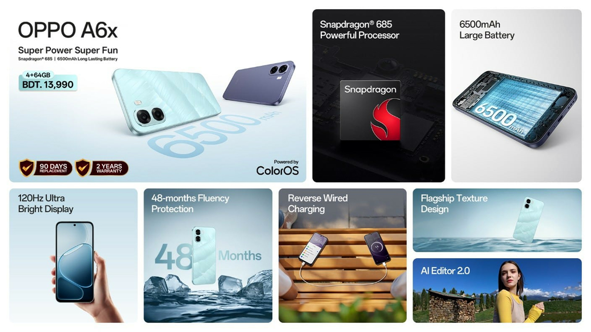এ বিষয়ে অপো বাংলাদেশ অথোরাইজড এক্সক্লুসিভ ডিসট্রিবিউটরের ম্যানেজিং ডিরেক্টর ডেমন ইয়াং বলেন, “যারা প্রতিদিনের সক্ষমতা ও বিনোদনের ক্ষেত্রে নির্ভরযোগ্য ডিভাইস চান, তাদের জন্য বিশেষভাবে অপো এ৬এক্স নিয়ে আসা হয়েছে। এর স্ন্যাপড্রাগন ৬৮৫ ও ৬৫০০ মিলিঅ্যাম্পিয়ার ব্যাটারি আপনাকে সামনে এগিয়ে যাওয়ার প্রেরণা জোগাবে। এর দীর্ঘমেয়াদী ফ্লুয়েন্সি প্রোটেকশন ব্যবহারকারীদের জন্য বছরের পর বছর ধরে আস্থা ও সমৃদ্ধ অভিজ্ঞতা জোগাবে।”