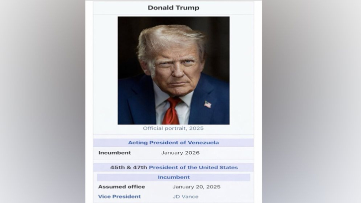 পোস্টটিতে ট্রাম্প নিজের একটি ছবি শেয়ার করেন। ছবির ক্যাপশনে উল্লেখ করা হয়, ২০২৬ সালের জানুয়ারি মাস থেকে তিনি ভেনেজুয়েলার ভারপ্রাপ্ত প্রেসিডেন্টের দায়িত্ব গ্রহণ করেছেন।