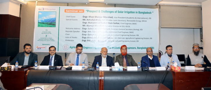 ইঞ্জিনিয়ার্স ইনস্টিটিউশন, বাংলাদেশ (আইইবি) এর কৃষিকৌশল বিভাগের উদ্যোগে বাংলাদেশের কৃষি খাতে টেকসই জ্বালানি ব্যবহারের প্রসার, জ্বালানি নিরাপত্তা নিশ্চিতকরণ, কার্বন নিঃসরণ হ্রাস এবং ডিজেলনির্ভর সেচ ব্যবস্থা থেকে উত্তরণ বিষয়ে করণীয় নির্ধারণের লক্ষ্যে 'বাংলাদেশে সৌর সেচের সম্ভাবনা এবং চ্যালেঞ্জ' শীর্ষক সেমিনারে বক্তারা বলেন, টেকসই জ্বালানি ব্যবহার প্রসার করতে এবং জ্বালানি নিরাপত্তা নিশ্চিত করতে এবং কার্বন নিঃসরণে বাংলাদেশে সৌর সেচের বিকল্প নেই।