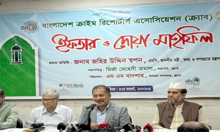 রোববার (১৫ মার্চ) ঢাকা রিপোর্টার্স ইউনিটিতে বাংলাদেশ ক্রাইম রিপোর্টার্স অ্যাসোসিয়েশন (ক্র্যাব) আয়োজিত ইফতার ও দোয়া মাহফিলের পর এক মতবিনিময় সভায় প্রধান অতিথির বক্তব্যে তিনি এসব কথা বলেন।