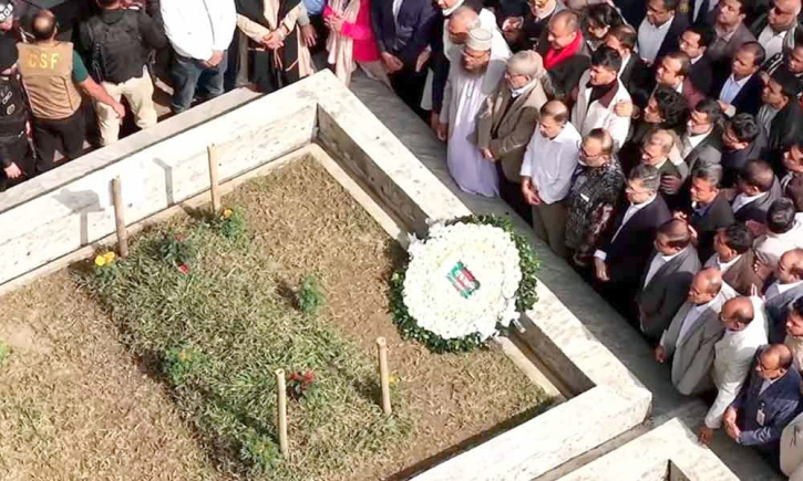 শনিবার সকাল সাড়ে ১১টায় ঢাকা বিশ্ববিদ্যালয়ের কেন্দ্রীয় মসজিদ সংলগ্ন কবরে ফুল দিয়ে শ্রদ্ধা জানিয়ে তিনি দোয়া ও মোনাজাত করেন।