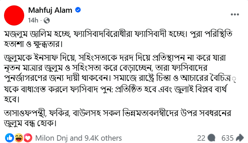 তথ্য উপদেষ্টা মাহফুজ আলম বলেছেন, মজলুম জালিম হচ্ছে, ফ্যাসিবাদবিরোধীরা ফ্যাসিবাদী হচ্ছে। পুরা পরিস্থিতি হতাশা ও ক্ষুব্ধতার।